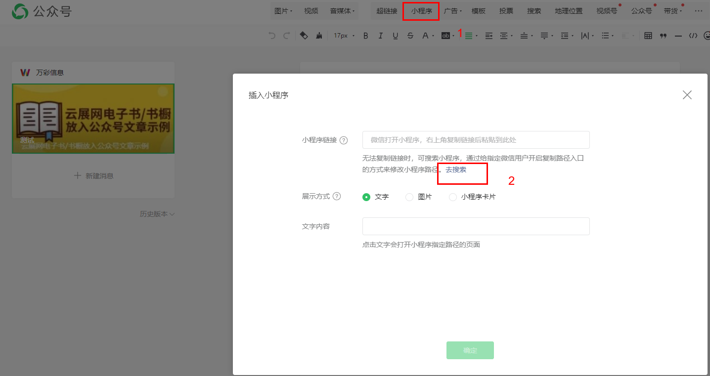 (1)創(chuàng)建公眾號(hào)文章,點(diǎn)擊【小程序】,【去搜索】