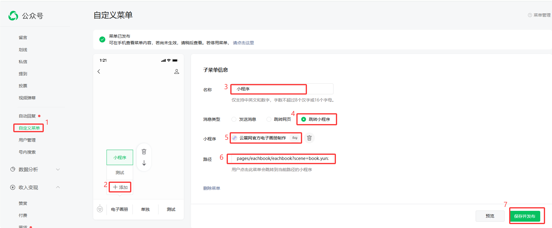 2、打開【自定義菜單】,點(diǎn)擊【添加】設(shè)置子菜單,輸入名稱,消息類型選擇跳轉(zhuǎn)小程序,選擇云展網(wǎng)官方電子畫冊制作小程序,輸入路徑地址