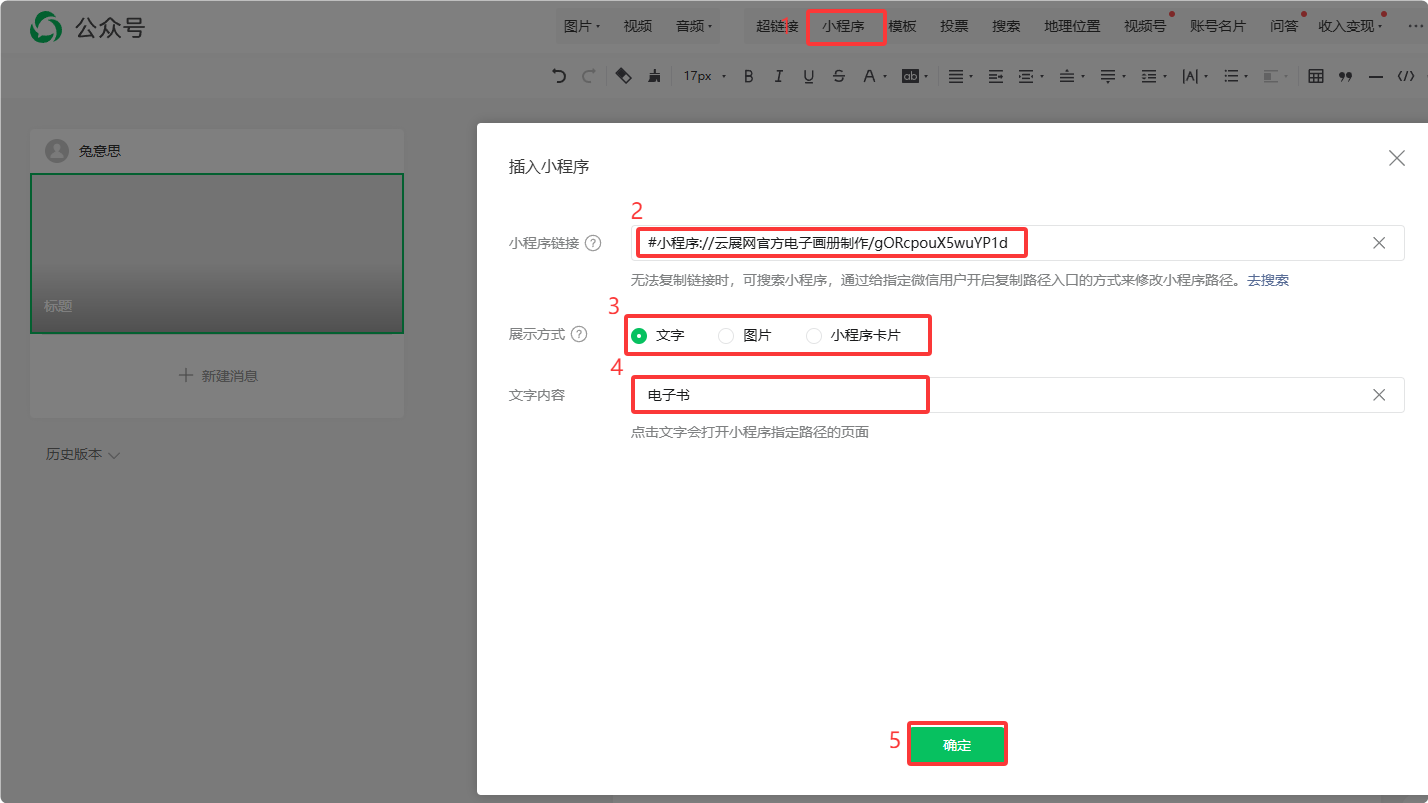2、編輯公眾號(hào)文章時(shí),點(diǎn)一下頁面上的【小程序】,輸入小程序鏈接,選擇展示方式等,然后確定